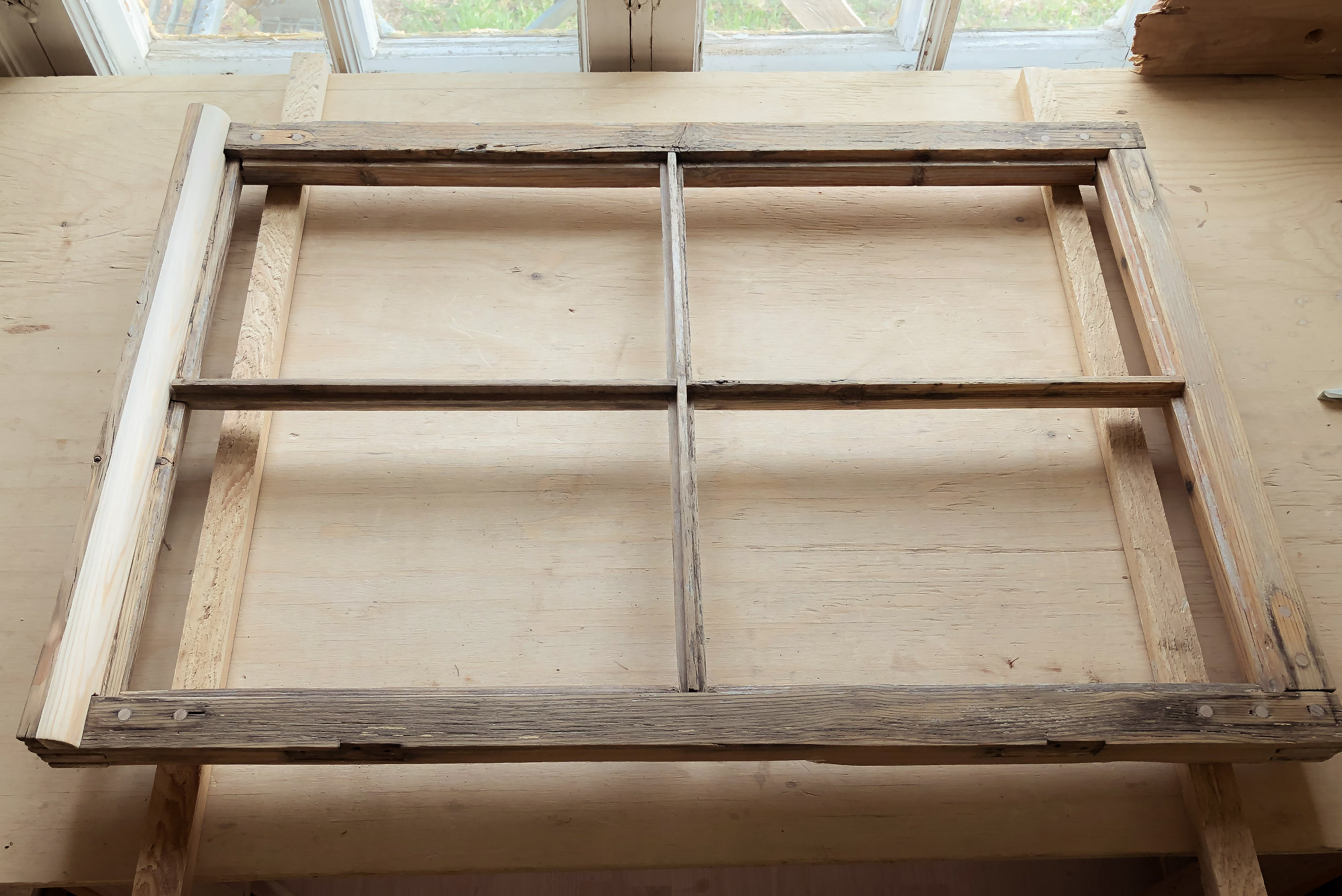 Kunnostettu ikkuna valmiina odottamassa karmeihin asettamista. Kunnostuksen myötä ikkuna sai taas monta vuosikymmentä lisää elinaikaa. |